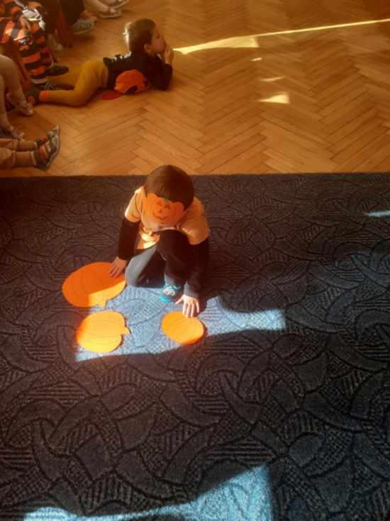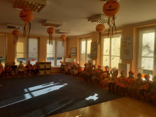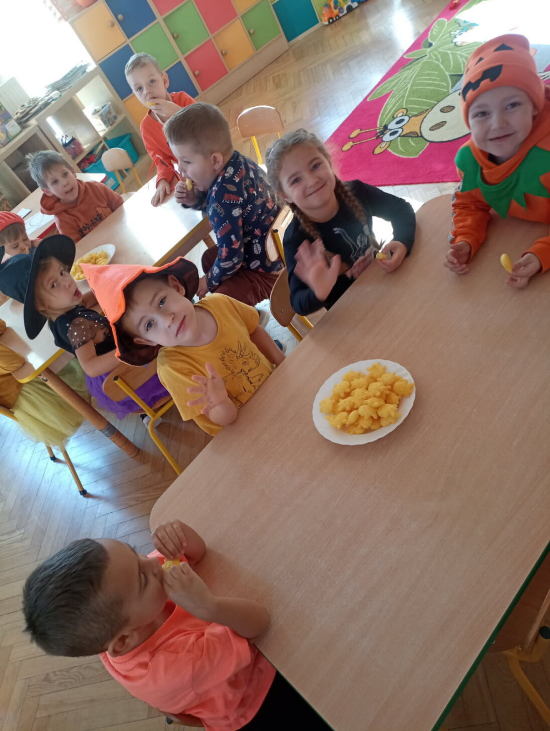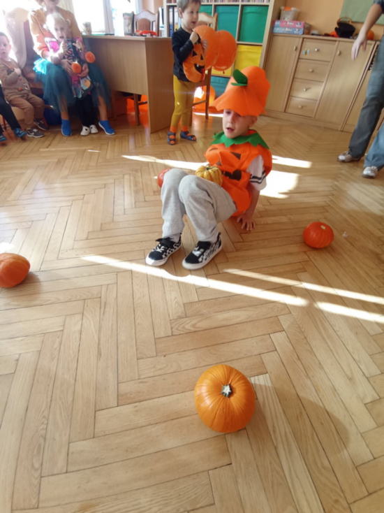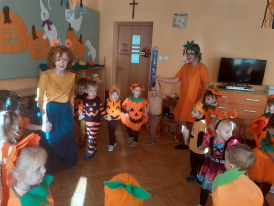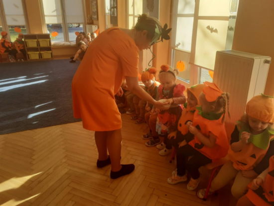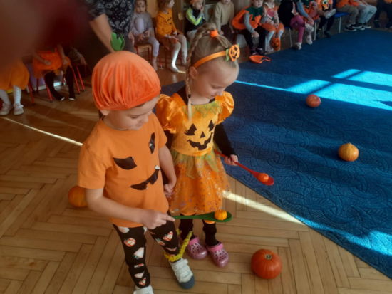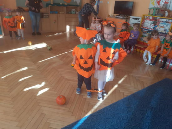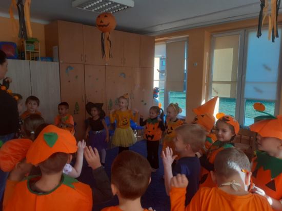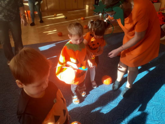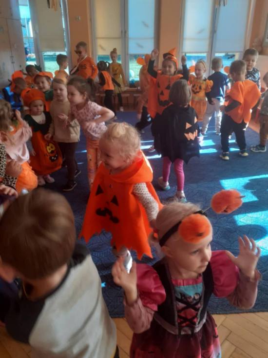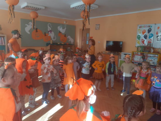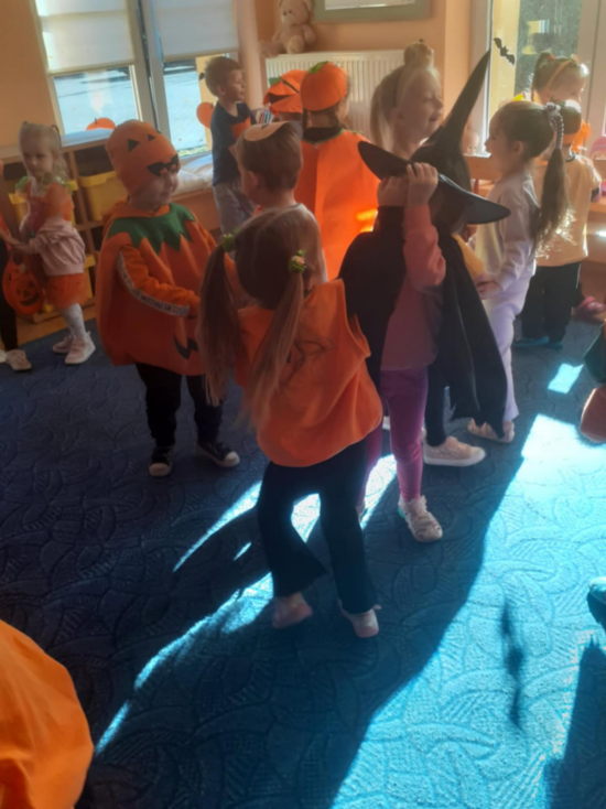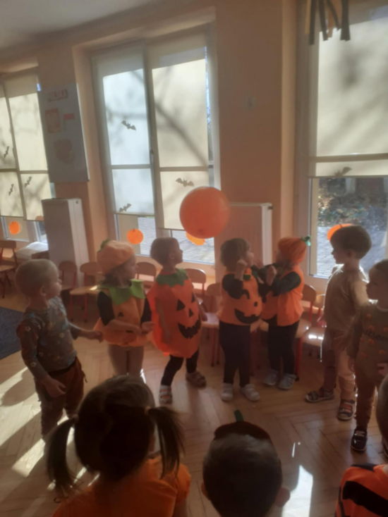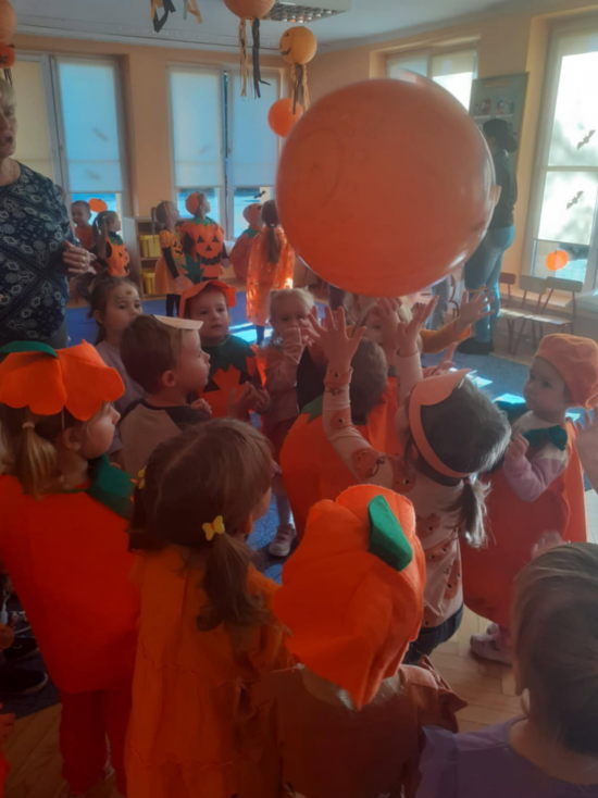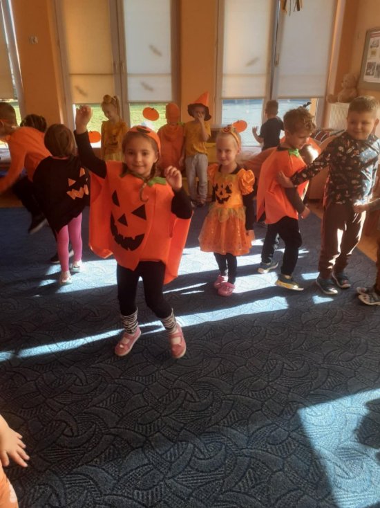 Dnia 31 października odbył się w naszym przedszkolu Bal u Pani Dyni. Piękne dekoracje sali oraz cudowne stroje przedszkolaków rozświetliły ponurą aurę za oknem. Świętowanie rozpoczęliśmy od zagadek, gier i zabaw o tematyce dyniowej. Następnie podczas pląsów w kółeczku, w parach, w pociągu oraz zabaw z balonami przedszkolaki z radością zaprezentowały swoje umiejętności taneczne. Sala wypełniła się ulubionymi utworami muzycznymi, śpiewem i śmiechem dzieci. Na zakończenie, każdy z przedszkolaków otrzymał słodki poczęstunek, a także konsumowaliśmy pyszne chrupki o smaku dyniowym. Ten dzień był niezwykłym przeżyciem pełnym radości i zabawy.