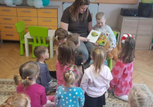 Czytanie na przedszkolnym dywanie to działanie realizowane w ramach projektu Mali czytelnicy oraz Mały Miś w świecie wielkiej literatury.Odbywa się ono cyklicznie co tydzień.Zaproszeni są co tydzień Rodzice , Dziadkowie,Ciocie a nawet starsze rodzeństwo, czytają książeczkę z domowego księgozbioru. W miesiącu lutym czytały książeczkę : babcia Marysi-Pani Ania, mama Nikodema-pani Patrycja.