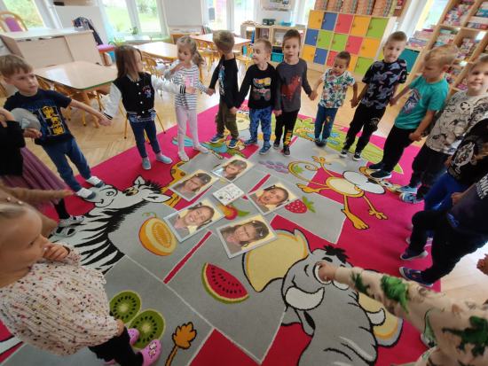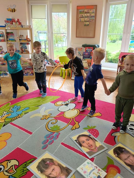 Realizacja zabawy łańcuszek komplementów pod hasłem „Dobre słowa” była kolejnym sposobem budowania relacji w grupie. Siedząc w kole dzieci przekazywały sobie uśmiechniętą buzię, co wprowadziło radosną atmosferę. Następnie na ich dłoniach zostały namalowane kolorowe buźki symbolizujące radość i życzliwość. Kolejnym etapem było wypowiadanie miłych słów do siebie nawzajem.