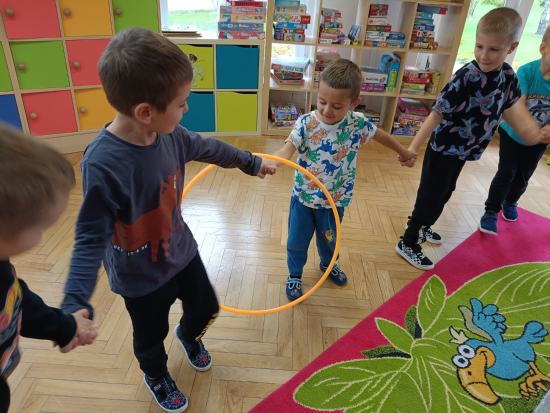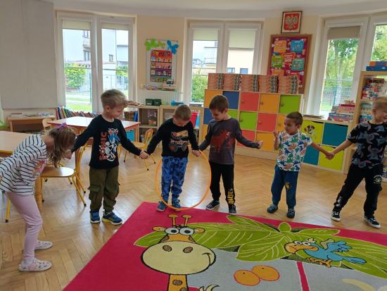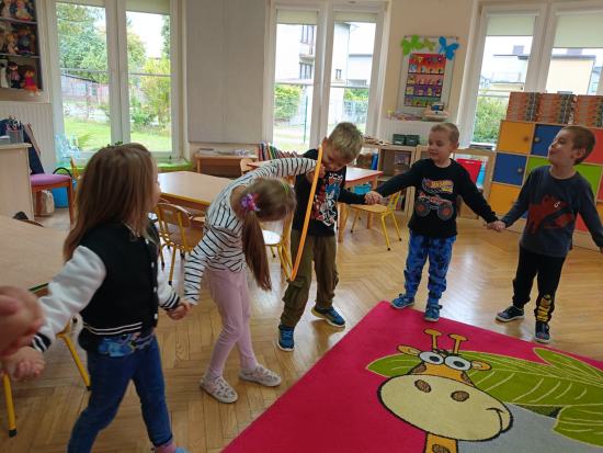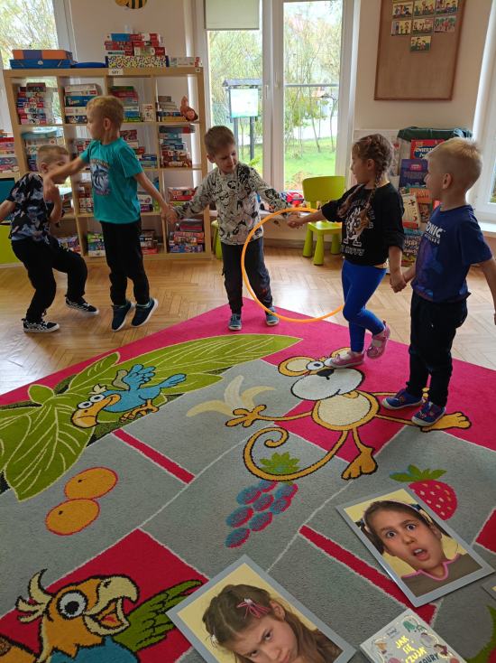 Następnym działaniem podjętym przez nasze przedszkolaki podczas Tygodnia Budowania Relacji był „Taniec przyjaźni”. Dzieci rozpoczęły zabawę tańcząc wspólnie w kole, a następnie dobierały się w pary. Po krótkiej sekwencji następowała zmiana partnera, dzięki czemu każdy miał okazję zatańczyć z każdym uczestnikiem. Zabawa była powtarzana codziennie, dbając o dobrą atmosferę wśród przedszkolaków.