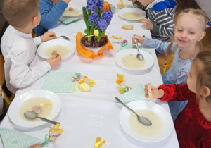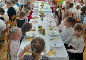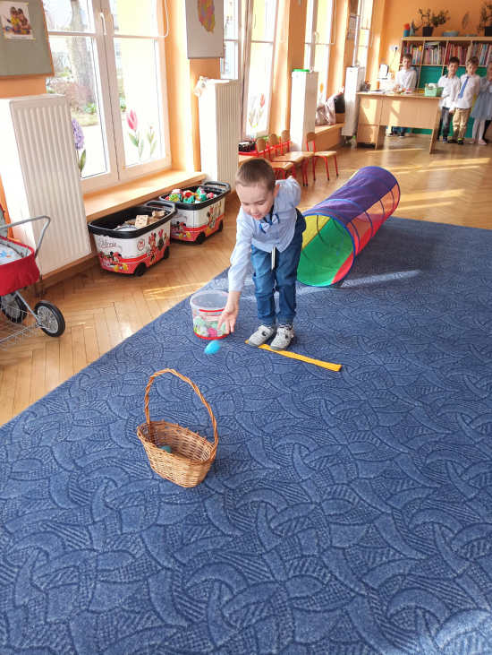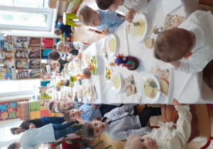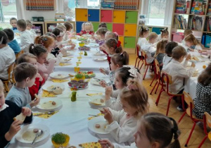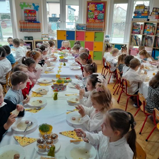 W naszym przedszkolu odbyło się wyjątkowe śniadanie, tego dnia w przedszkolu zapanowała ciepła i świąteczna atmosfera. Przez ostatnie dni dzieci m. in. poznawały różne tradycje związane ze świętami Wielkiej Nocy, rozmawiały o symbolice świątecznych pokarmów, wspólnie z wychowawczyniami dekorowały sale, malowały pisanki, śpiewały piosenki związane z tematyką wiosenno – świąteczną. Zwieńczeniem licznych opowieści o zwyczajach wielkanocnych było wspólne świąteczne śniadanie. Dzieci w odświętnych strojach zasiadły do stołu, aby w gronie najbliższych kolegów podzielić się jajkiem i złożyć sobie życzenia. Wspólne, uroczyste śniadanie oraz rożnorodne aktywności wywołały miłe i niezapomniane doznania, które na długo pozostaną w pamięci wszystkich przedszkolaków.