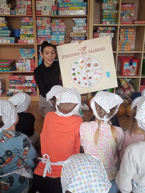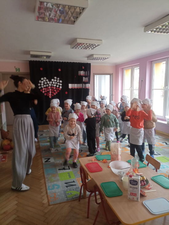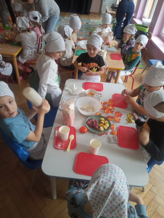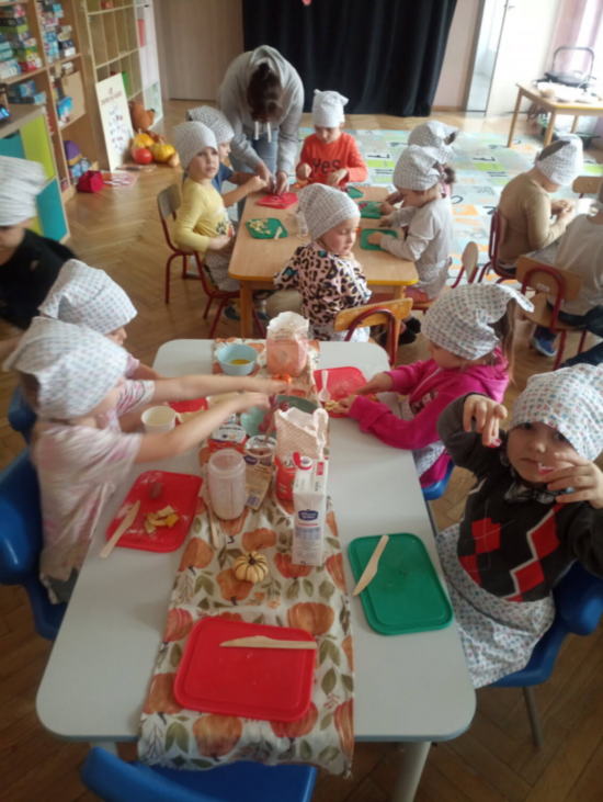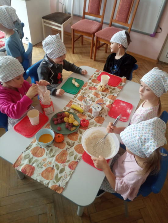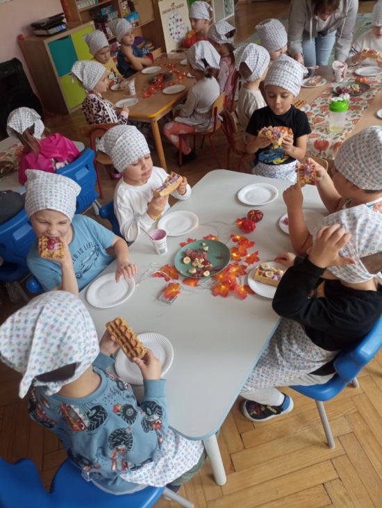W listopadzie przyjechały do nas Panie dietetyczki i przeprowadziły Warsztaty kulinarne „Zdrowie na talerzu” . W tym dniu dzieci uczyły się zdrowego odżywiania przez zabawę, wspólne gotowanie i praktyczne porady, pomagając budować zdrowe nawyki żywieniowe, planować zbilansowane posiłki i odkrywać nowe smaki. Dzieci w tym dniu samodzielnie przygotowały gofry dyniowe bez cukru, ze zdrowymi dodatkami. Wszystkim zdrowy, pyszny deser niesamowicie smakował!